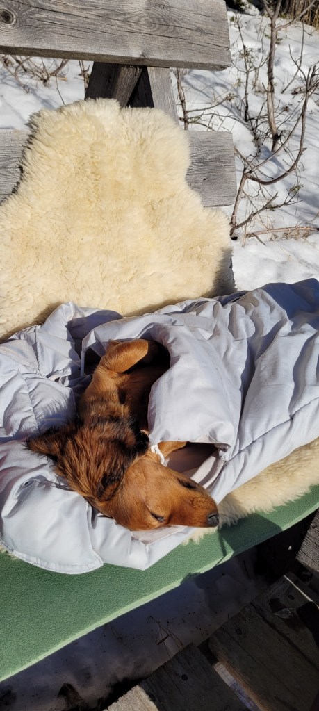 Vårvintern i Björksele. Skimra får följa ner till Järvens Soffa. Hon åker i skarklådan ner dit. Springer runt och upptäcker och hälsar på alla. Går bort från fikaplatsen när hon behöver kissa och har lärt sig krypa ihop och sova när hon är trött, trots att skotrar och folk rör sig. Jag tycker att hon är så duktig, min lilla tjej ♥️