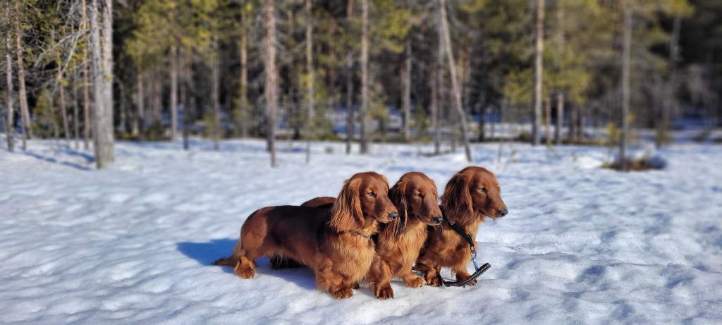 Just gått efter ännu hårda och fina skoterspår i skogen. Taxarna hitta många goda dofter av älg, rådjur och räv.