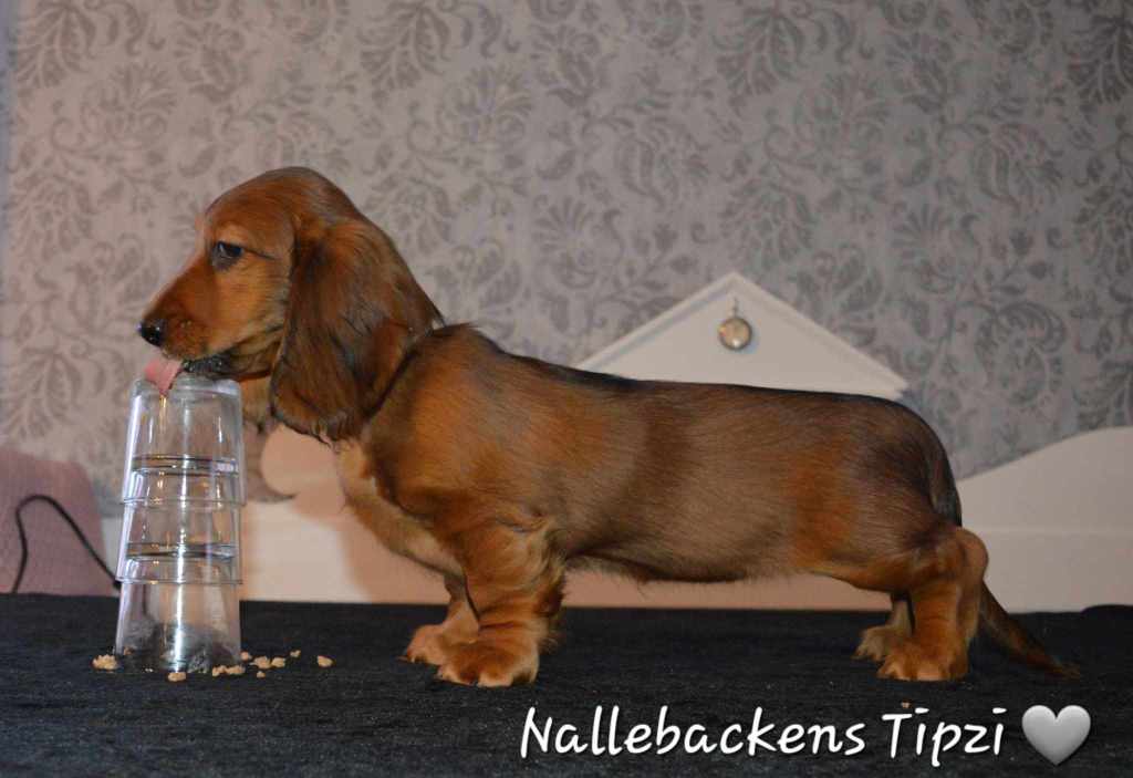 På bilderna är hon 10 v och 8 månader. Som valp ställdes hon två gånger. Taxklubben i Öjebyn i juli där hon blev BIR valp och BIS 2 valp. Sen ställdes hon även i Överkalix på SKK i augusti. Där blev de träning i regnet då jag anmält båda flickorna och dom skulle gå fint utan att busa med varandra och dessutom fick Tipzi gå med Ulla
