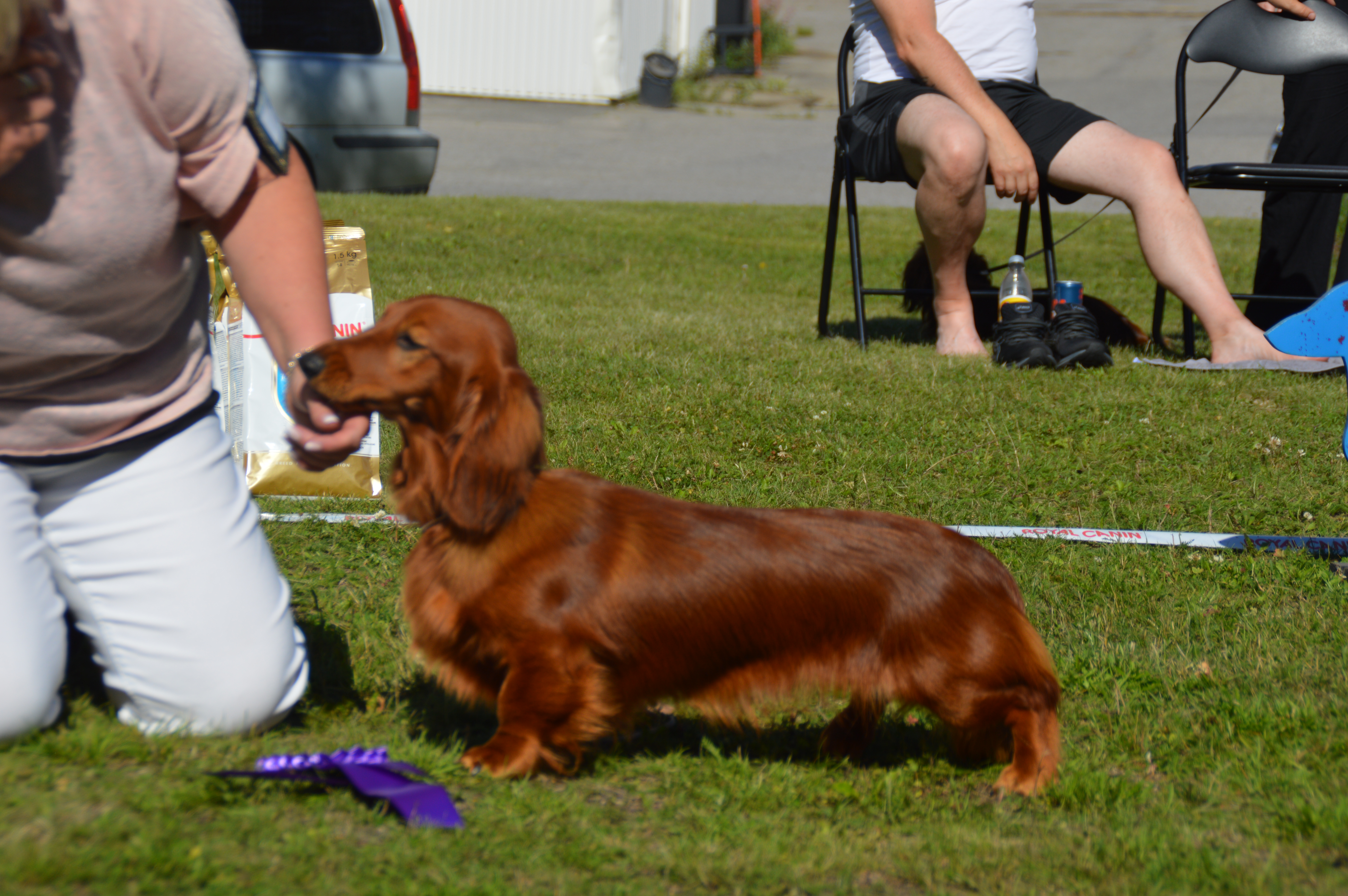På bilderna är hon 10 v och 8 månader. Som valp ställdes hon två gånger. Taxklubben i Öjebyn i juli där hon blev BIR valp och BIS 2 valp. Sen ställdes hon även i Överkalix på SKK i augusti. Där blev de träning i regnet då jag anmält båda flickorna och dom skulle gå fint utan att busa med varandra och dessutom fick Tipzi gå med Ulla